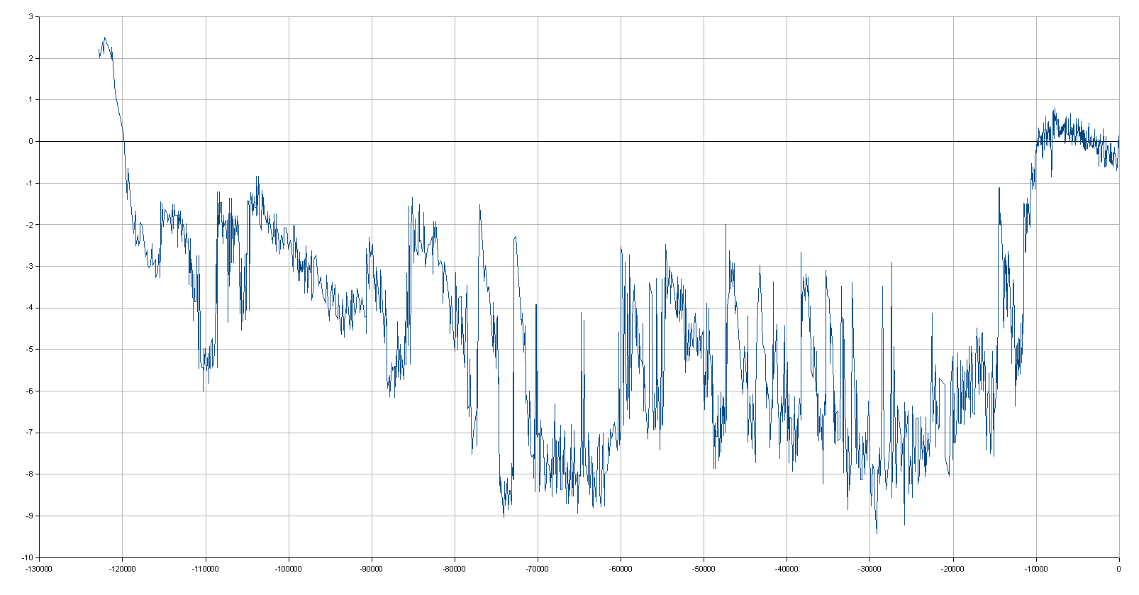 Grönlandi klíma az utolsó eljegesedési periódus alatt. Az "Y" tengelyen a hőmérséklet eltérését látjuk a maihoz képest A "mai" hőmérséklet az az 1960-1990 évek átlaga. A vízszintes, azaz "X" tengely az időt mutatja, 1990-től visszafelé számolt években (az idő balról jobbra "telik").